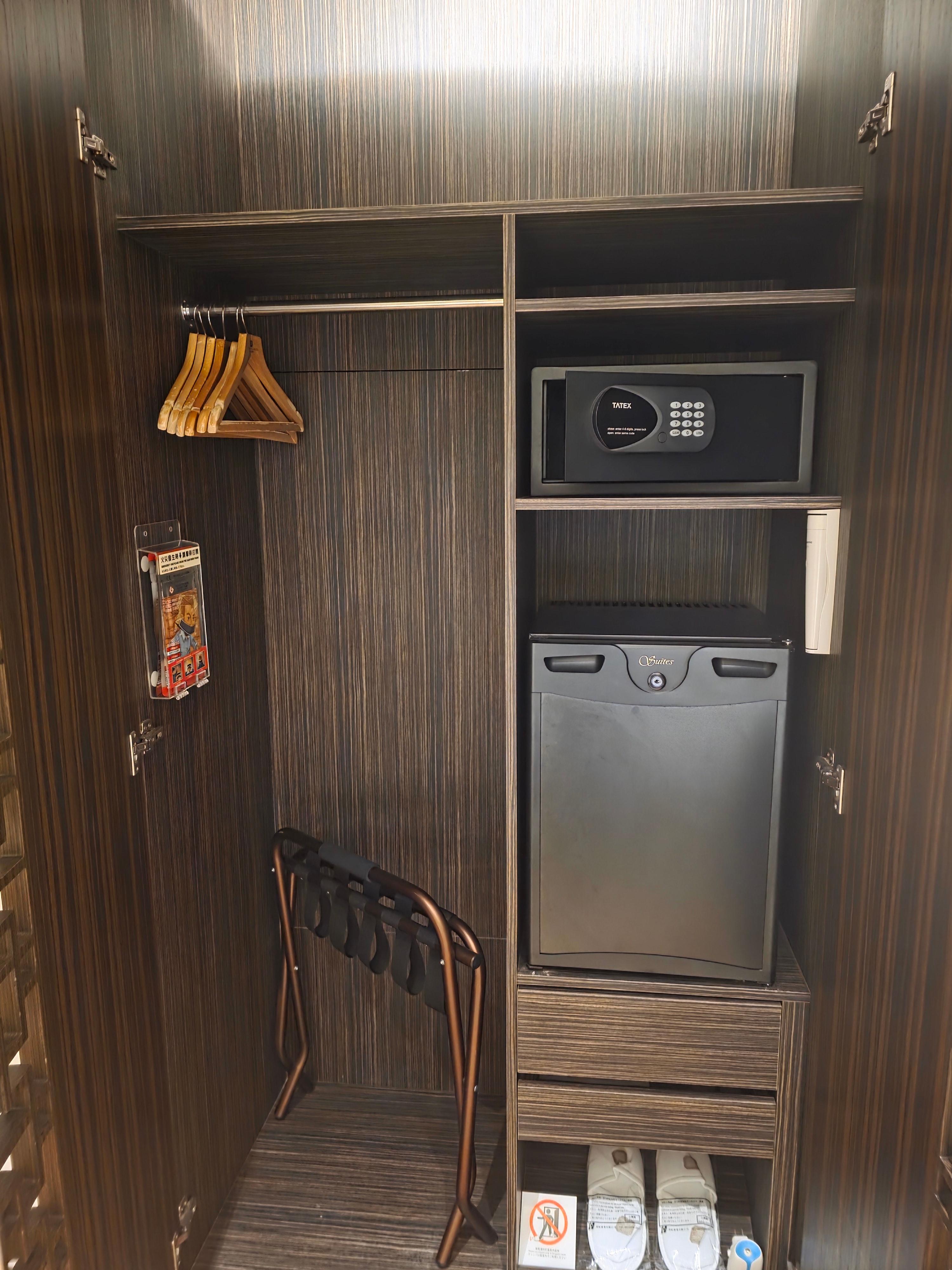 역시나 냉장고는 텅텅 비어 있고요. 비치돼 있는 건 생수 2개, 드립커피 2개, 우롱차 2개입니다. 우롱차가 맛있었어요! 그리고 대만 호텔 대부분은 110V 중심인데요. 여긴 110V도 있고 220V도 있어서 굉장히 편했습니다.