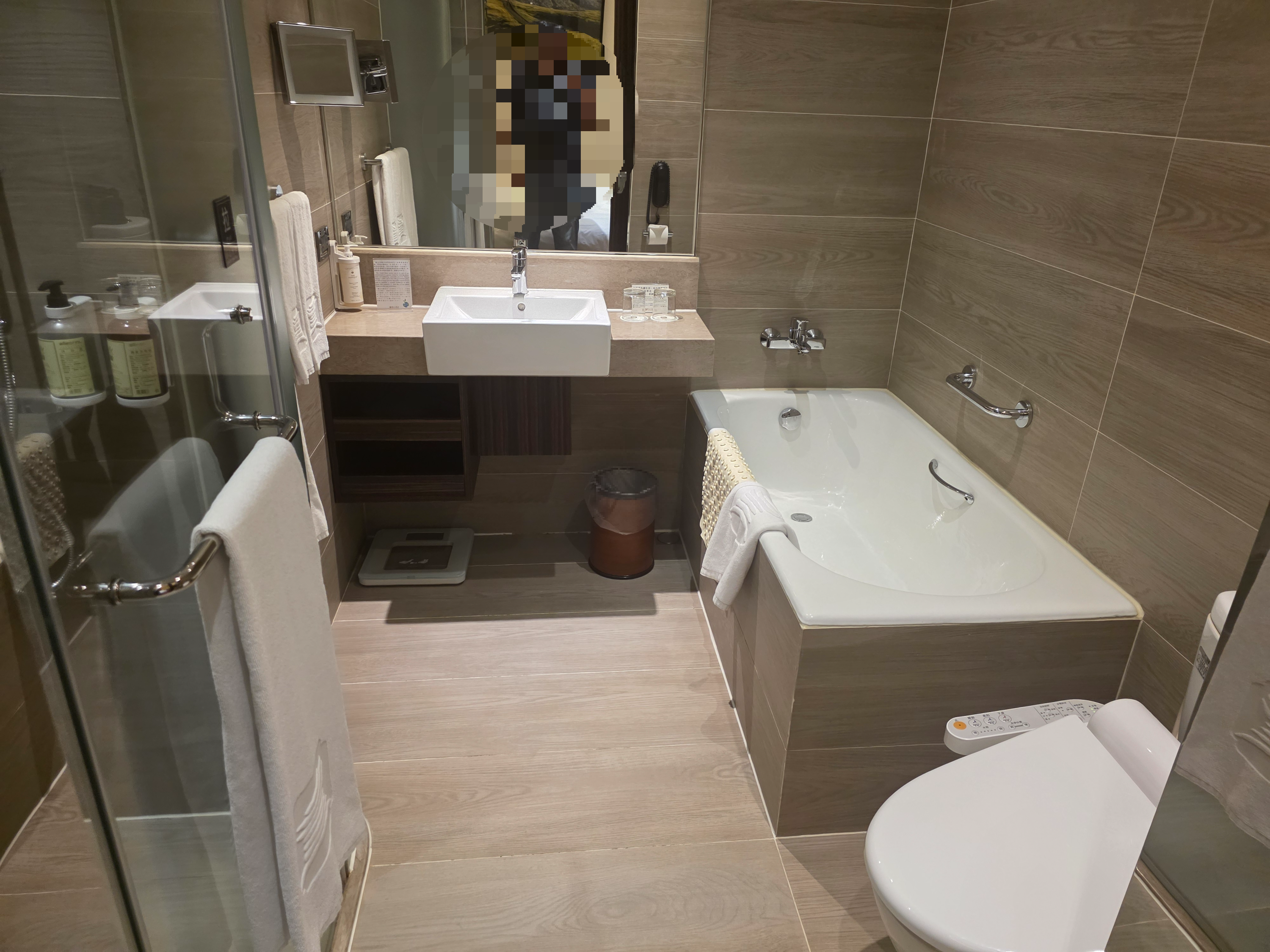 욕실은 훌륭했습니다. 깨끗했고 드라이기는 물론 체중계도 있었습니다. 수압은 아주 세지는 않았어요. 수압은 조금 아쉬웠지만 그래도 깨끗하고 관리가 잘 되고 있다는 걸 느꼈습니다. 객실에 비해 욕실이 조금 큰 듯한 느낌이었어요.